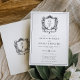 Élégant Monogram Crest Rose, Faire-part de mariage en noir et blanc intemporel, présente un monticule vintage formel accentué de roses français, typographie classique et un cadre délicat.