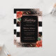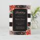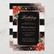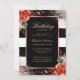 Belle invitation de fête d'anniversaire à fleurs d'or noir et rose avec des roses rouges d'aquarelle et des confettis d'or rose contre un arrière - plan noir et blanc. Personnalisez facilement ce modèle à n'importe quelle fête d'anniversaire.