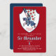Préparez-vous à accueillir une fête royale avec une touche de charme médiéval ! Cette délicieuse invitation d'anniversaire comporte un chevalier équestre audacieux encadré d'un majestueux bouclier blanc à la bordure bleu marine, le tout sur fond rouge vif. Le nom de l'enfant d'anniversaire se distingue par sa typographie blanche avec un contour rouge, assorti aux couleurs du bouclier. Les détails de la fête (heure, date et emplacement) sont affichés dans une police simple et propre, ce qui assure une clarté à l'égard d'un arrière - plan blanc immaculé. Retournez la carte, et vous découvrirez un bleu foncé élégant, en continuant le thème royal. Parfait pour une journée amusante de chevaliers, de chevaux et d'aventure, cette invitation promet une fête d'anniversaire médiévale inoubliable ! Idéal pour les anniversaires d'enfants avec une ambiance médiévale ludique. Explorez la collection complète pour plus de designs qui partagent ce thème enchanteur!