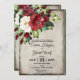 Exquise couleur rouge foncé et blanc aquarelle à angle floral sur un arrière - plan gris gringe. Un script élégant et une combinaison de polices serif pour les détails des faire-part de mariage. À l'arrière de l'invitation se trouve l'élégant arrangement floral avec les noms du couple et la date mariage.