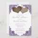 Complement your rustic purple wedding party with this elegant bridal shower invitation featuring two burlap hearts and delicate floral lace. Matching items available.