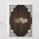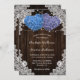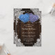 Invitations de mariage rustique violet et bleu avec deux fleurs d'hydrangée en forme de coeur sur un arrière - plan en bois de grange orné de dentelle fleurie blanche et de lampes à cordes. Un mariage élégant et romantique est parfait pour votre mariage rustique violet et bleu. Éléments correspondants disponibles.