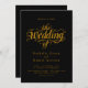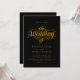 Cette élégante faire-part de mariage en noir et or est parfaite pour un mariage moderne. Le design simple présente une élégante calligraphie dorée sur un arrière - plan noir. La carte d'invitation comprend les détails du mariage au dos au lieu de payer une carte d'enceinte séparée.
