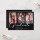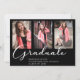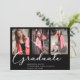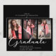 Invitation photo de la fête de graduation noire avec une police de script élégante et 3 photos sur le devant. Le dos est noir avec du texte blanc, mais entièrement personnalisable avec l'outil de design de Zazzle.