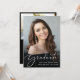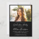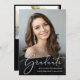 Célébrez les réalisations de votre diplômé grâce à cette élégante faire-part noire de graduation et à l'invitation de la fête. La photo préférée de la grade remplit le devant de la carte avec "Graduate" superposé sur le dessus dans un script blanc élégant; en dessous, ajouter son nom, l'école et l'année de classe. Au verso, ajoutez une photo supplémentaire et les détails de votre fête de remise de diplômes en lettres blanches simples.