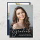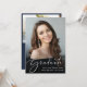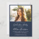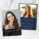 Célébrez les réalisations de votre diplômé avec cette élégante invitation à la fête de remise de diplômes bleue. La photo préférée de la grade remplit le devant de la carte avec "Graduate" superposé sur le dessus dans un script blanc chic; en dessous, ajouter leur nom, l'école et l'année de classe. Au dos, ajoutez une photo supplémentaire et les détails de votre fête de remise de diplômes en lettres blanches simples.