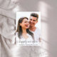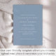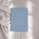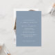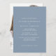 Faire-part de mariage bleu poussiéreux moderne et minimaliste avec votre invitation dans une élégante typographie blanche d'un côté, et votre photo superposée avec "Happily Ever After" dans un script blanc chic avec des swashes et vos prénoms et votre date mariage réunis avec un coeur de l'autre côté.