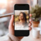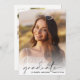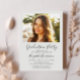 Élégante invitation de la fête de remise de diplômes avec la photo de la grad superposée avec "diplômé" dans un script moderne et leur nom et année de classe dans la simple typographie. À l'envers, ajoutez une photo supplémentaire et les détails de la grande fête.