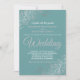 Ce faire-part de mariage présente un design simple mais élégant avec des lettres de script gris et blanc sur un arrière - plan turquoise. La simplicité de la conception est compensée par les fraises en fausse feuille argent dans les coins. Le flegree est orné et floral et offre un contraste agréable avec le texte sobre. Le libellé est formel et traditionnel, mais l'agencement chic le rend moderne et accessible.