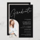 Elégant simple moderne blanc sur l'invitation de graduation photo noir faire-part avec police de script de brosse moderne cool, 2photos, et une arche superposition. Une excellente célébration pour la fête portes ouvertes du lycée.