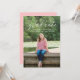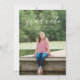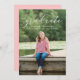 Invités Invitations pour célébrer la grade avec nos invitations tendance Elegant Script Overlay graduation soirée. Le devant des invitations minimales à la fête de remise de diplômes affiche la photo préférée du diplômé avec "diplômé" en écriture blanche et le nom du diplômé, l'école et l'année de fin d'études ci-dessous. L'arrière des invitations montre "célébrer la grade !" avec les détails de votre fête illustrés ci-dessous en texte noir contre un arrière - plan rose vif.