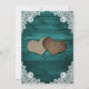 Cette faire-part de mariage turquoise romantique et rustique avec deux coeurs de burlap contre un arrière - plan en bois de grange orné de dentelle blanche fleurie et de lampes à cordes est parfaite pour inviter vos invités à votre turquoise fête de mariage rustique, de jardin ou de grange.