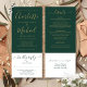 Une invitation de mariage tout-en-un avec des noms de signature modernes en écriture et une typographie dorée élégante sur un fond vert émeraude. L'invitation comprend une carte de réponse qui peut être détachée et des informations pour les invités. Conçue par Thisisnotme©