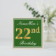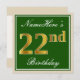 Invitation Élégant, Vert, Faux Or 22ème anniversaire + Nom