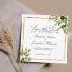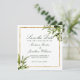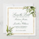 Cette élégante invitation botanique Save the Date est encadrée de beaux feuilles d'aquarelle verte et de jolies vignes d'olivier. Cette belle verdure et couleur foncée arrière est parfait pour un événement chic de chute pour une mariée et marié moderne. encadré d'un joli rectangle doré derrière l'accent vert de la feuille.