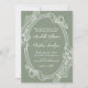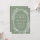Sage Green Filigree Frame Wedding Invitation. Add a touch of timeless elegance to your wedding with this refined and romantic design. The invitation features a soft sage green background on both sides, paired with a delicate white oval filigree frame made up of graceful swirls and flourishes for a classic, airy look.