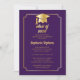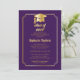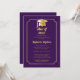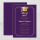 Un bouchon de fin d'études en or avec les mots "classe de 2024" et cadre à échalotes or et violet design d'invitation à la fête de remise de diplômes qui peut être personnalisée pour les diplômes d'études secondaires, collégiales, universitaires ou professionnelles. Conception composite par Holiday Hearts Designs (droits réservés).