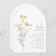 A soft, elegant baby-shower invitation featuring watercolor yellow wildflower illustration on a white, arch-shaped card. The design blends delicate botanical artwork with modern, minimalist typography. Warm neutral tones and a gentle, nature-inspired aesthetic create a serene and inviting look, perfect for a springtime celebration.