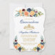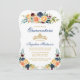 Elégante aquarelle moderne Floral and Greenery Quinceanera Invitation comprend jaune doré, pêche, fleurs et roses bleus et bordeaux, verdure botanique et écriture or. Gold Tiara Crown.