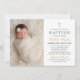Cette élégante invitation de baptême ou de christéma fille comprend une photo de bébé personnalisable ainsi qu'un texte vert stylé, or et noir doux accentué d'une croix dorée. Tout le texte peut être entièrement personnalisé pour votre événement. Un beau motif floral coordonné de fleurs de rose blanches, crème et rose pâle avec de la verdure verte et or habille le dos de la carte.