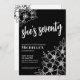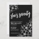 Soixante-dix Black White 70th Birthday Party Invitation. Une invitation amusante mais élégante à la fête du 70e anniversaire avec des fleurs blanches et noires girly pour les jeunes de coeur. Un motif de fleurs ludique encadre une typographie de script "elle est soixante-dix" mélangée avec une police serif plus classique. Célébrez soixante-dix ans de vie avec ce magnifique design botanique. La partie amusante est que vous pouvez changer TOUTES les couleurs! ! Vous pouvez non seulement modifier les couleurs et la police arrière - plans, mais vous pouvez également modifier les lignes des fleurs. Disponible sous forme d'invitation imprimée ou d'invitation numérique téléchargeable que vous pouvez envoyer par e-mail ou avoir imprimé localement !