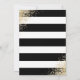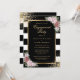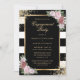 Élégante invitation de fiançailles rayées en noir et blanc avec des fleurs roses rousses encadrant les détails de l'événement dans un cadre doré orné de confettis dorés. Éléments correspondants disponibles. Invitation florale florale floue. Invitation de la partie fiançale noire et or.