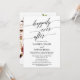 Cette élégante calligraphie avec carton de réception de fuite avec fond floral est parfaite pour une fête post-fuite d'automne. Le design présente une typographie romantique et fantaisiste avec un magnifique bouquet de fleurs rose blush, marsala et bordeaux sur le fond. Les cartes de RSVP sont vendues séparément.