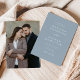 Invitations de mariage élégantes avec vos noms et détails mariages en lettres blanches avec un arrière - plan bleu poussiéreux. Un script de calligraphie moderne complète l'apparence de cette faire-part de mariage bleue poussiéreuse chic. L'invitation inverse pour afficher votre photo fiançailles préférée. Ce faire-part de mariage photo simple est parfait pour les mariages formels et décontractés de toute saison.