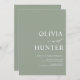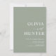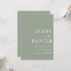 Cette élégante invitation de mariage comprend une calligraphie moderne et une typographie audacieuse classique. Avec son arrière - plan vert sage tendance, il est chic et frais. Les noms du couple sont audacieux, ce qui en fait la faire-part de mariage minimaliste ultime.