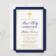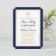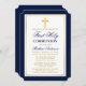 Elégant Marine Bleu et Or Première Sainte Communion Invitation avec Croix. Cadre Or. Croix d'or.