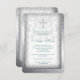 Elégant tourbillons gris argenté et blanc damassé avec croix blanche nacrée première invitation à la communion sainte. Cette jolie invitation de première communion damasée blanche est facilement customisée pour votre événement en ajoutant les détails de votre événement, le style de police, la taille et la couleur de police et le libellé.