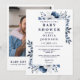 Cette invitation élégante de baby shower avec motif floral champêtre bleu marine peut être personnalisée avec vos informations en typographie moderne, une photo spéciale au verso et votre code QR de liste de naissance. Conçue par Thisisnotme©