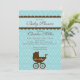 Commencez votre baby shower de garçon outre de la droite avec notre damassé élégante avec l'invitation de baby shower de bébé de voiture d'enfant. L'invitation comporte un arrière - plan bleu élégant de damassé avec un bord de feston de bande bleue et de brun avec une voiture d'enfant brune vintage. conceptions ©Babystar
