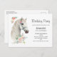 Invitation d'anniversaire avec une illustration magique de la tête d'un beau cheval blanc. Entouré de petites fleurs roses mignonnes. Ambiance élégante boho pour les amoureux des chevaux.