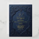 Cette conception d'invitation dégage de l'élégance et de la sophistication, avec un fond bleu foncé orné d'un embossage argenté complexe. Le point central est les initiales dorées du couple, magnifiquement écrites. Les détails du mariage sont affichés bien en vue dans des polices blanches contrastées, invitant les invités à se joindre à la fête.