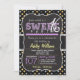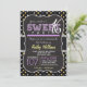 Cute Sweet 16, seize, invitation aux étoiles jaunes, noires et grises, motif de nuit étoilé aux éléments de conception en ric violet. 16e, seizième anniversaire invitation de fête pour filles. Vintage se sentir girly violet et jaune craie polices sur cool tableau noir arrière - plan.