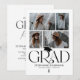 Célébrez votre diplômé dans un style intemporel et sophistiqué avec cette élégante invitation de fête de remise de diplôme noir et blanc. Sur un fond blanc chic, la typographie moderne serif « GRAD » crée un point focal raffiné, complété par une icône de capuchon de graduation stylisée positionnée au-dessus du « R ». La queue fluide du « R » se transforme en un gland élégant, reliant de manière transparente le nom du diplômé, l'école, le collège ou l'université, et l'année de promotion pour un look luxueux et cohérent.