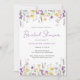 Une élégante invitation à la douche à la nuptiale fantaisie avec "Fête des mariées" présentée dans un script chic violet et des aquarelles d'inspiration boho de fleurs sauvages mauve, rose et jaune. Personnalisez le nom et les détails de la douche de la mariée en lettres simples grises et violettes.