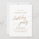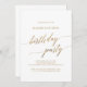 Cette élégante invitation d'anniversaire de calligraphie or est parfaite pour une simple fête d'anniversaire. Le design neutre présente une carte minimaliste décorée avec une typographie romantique et fantaisiste de feuille d'or. Remarque : Ce design ne comporte pas de véritable feuille d'or. C'est un graphisme de haute qualité fait pour ressembler à du papier doré.