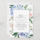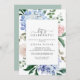 Cette élégante hydrangée bleue fêtons l'invitation est parfaite pour une fête de printemps ou d'été, mariage après la fête, la retraite, la remise des diplômes ou tout événement heureux. Le design floral classique est composé d'hydrangées bleu poudre douce, agrémentées de fleurs roses neutres et de feuilles verts.