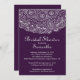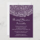 Belle invitation à la douche nuptiale en dentelle vintage élégante, imprimée sur dentelle blanche, posée sur un élégant arrière - plan moderne en violet aubergine. Retournez l'invitation pour trouver une couleur correspondante pour une touche spéciale supplémentaire. Disponible dans notre boutique dans une large sélection de choix de couleurs modernes et chic que votre mariée aimera. Facile à personnaliser avec vos informations de fête et garanti pour faire une première impression parfaite. Invitation parfait pour une douche nuptiale d'été, douche nuptiale de printemps, douche nuptiale d'automne ou douche nuptiale d'hiver.