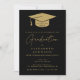 Cette invitation de fête de remise de diplôme élégante noire et or peut être personnalisée avec les détails de votre célébration. Conçue par Thisisnotme©