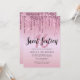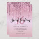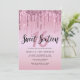 Ce design d'invitation moderne présente une parties scintillant à goutte d'or rose et violet faux, une texture métallique et une police de calligraphie élégante.