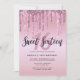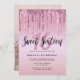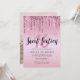 Ce design d'invitation moderne présente une parties scintillant à goutte d'or rose et violet faux, une texture métallique et une police de calligraphie élégante.