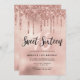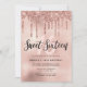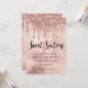 Ce design d'invitation moderne comprend des parties scintillant en or faux rose et cuivre rose gouttant texture métallique et élégante police calligraphie.