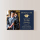 Élégante invitation à la fête de remise de diplômes de l'université bleu foncé avec un casquette diplômé d'or, la photo du diplômé, leur nom dans la typographie classique de la serif d'or, et leur école, major, distinctions ou plans futurs. Personnalisez les détails de votre fête à l'arrière.