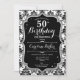 Elégante invitation à 50e anniversaire fleurie avec votre photo au verso de la carte. Design blanc noir glam avec faux parties scintillant argent. Comprend un motif damassé noir et blanc, une police de script et des confettis. Parfait pour une fête anniversaire adulte élégante. Personnalisez avec vos propres détails. Peut être customisé pour n'importe quel âge ! Invitations Zazzle imprimées ou téléchargement instantané modèle imprimable numérique.