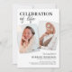 Élégantes invitations funéraires commémoratives avec un simple arrière - plan blanc, 2 photos de la personne décédée, le titre "célébration de la vie", et les détails funéraires.
