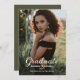 Élégant texte de script blanc "Graduate" superpose la conception minimaliste simple de la photo avant avec coordination du message de faire-part blanc sur le dos.