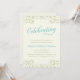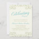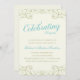 Une invitation élégante pour votre fête d'anniversaire de mariage doré de 50 ans. Un texte élégant en écriture cursive indique "Célébrer 50 ans" dans une jolie nuance de bleu turquoise. De belles volutes dorées le long du haut et du bas de l'invitation encadrent le texte.